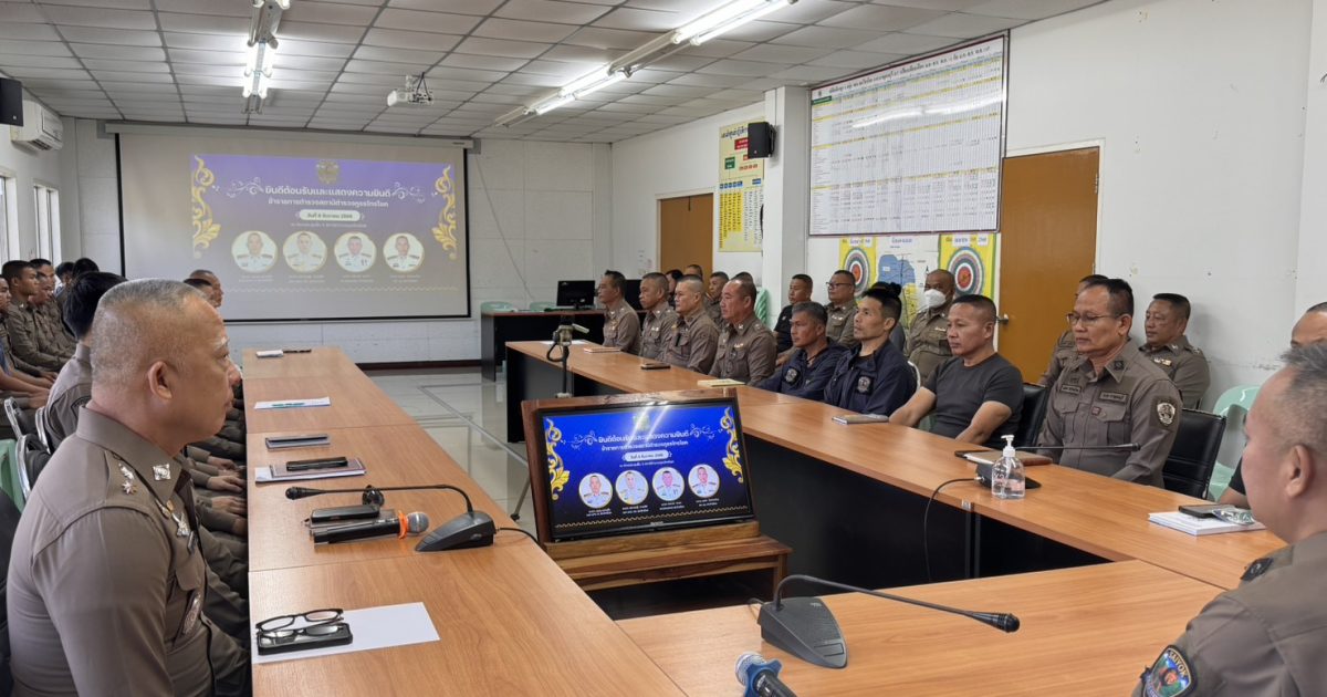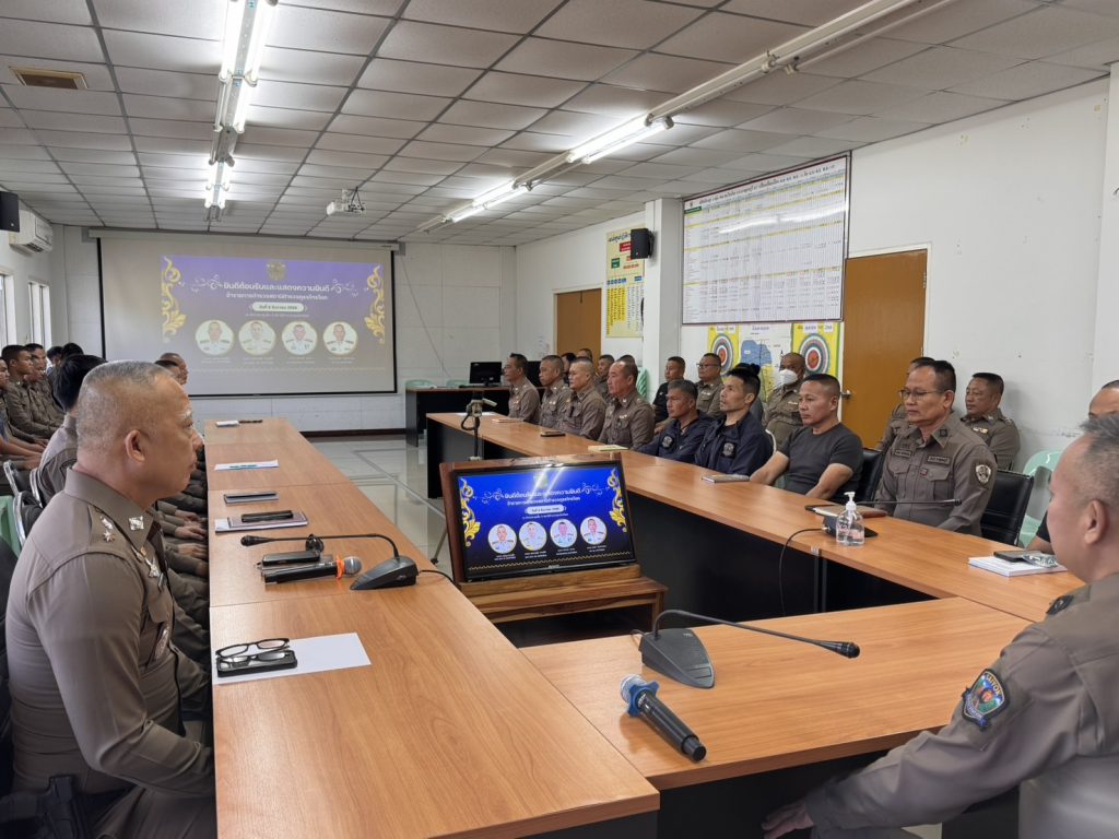 ผู้กํากับการสถานีตํารวจภูธรไทรโยค ชี้แจงและให้ข้อมูลเกี่ยวกับการประเมินแก่เจ้าหน้าที่ตํารวจในสถานีตํารวจภูธรไทรโยค