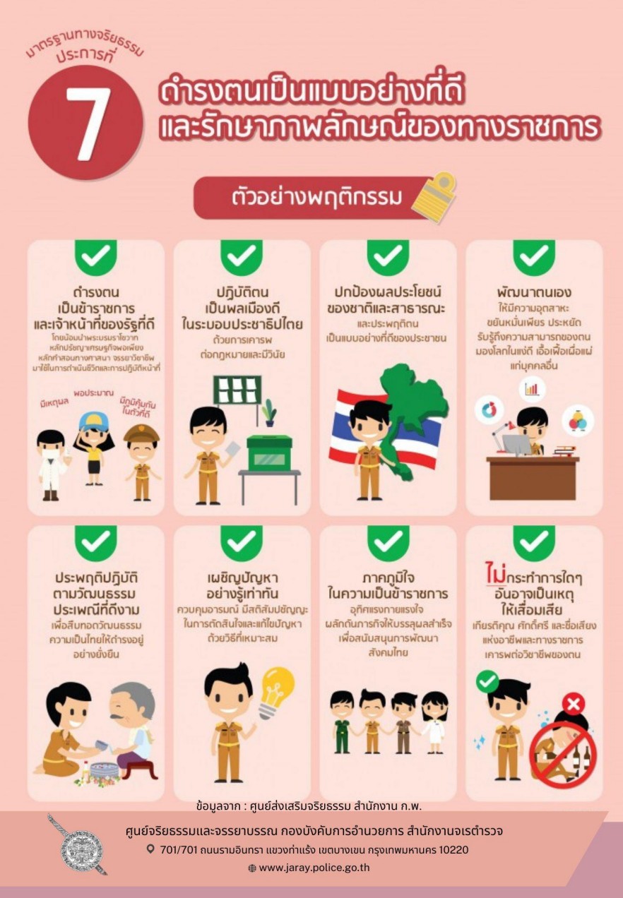7.ดำรงตนเป็นแบบอย่างด้วยการเป็นข้าราชการที่ดี รักษาภาพลักษณ์ของทางราชการและความเป็นผู้พิทักษ์สันติราษฎร์